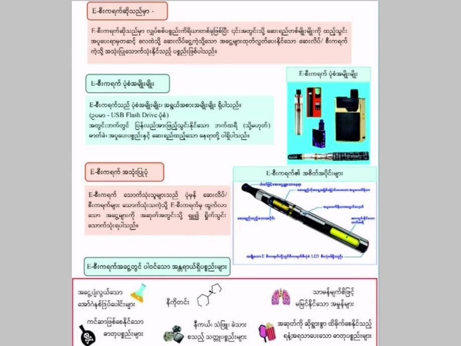 Since 2000 in Myanmar, the control of smoking and tobacco use is being carried out as a priority in the National Health Initiatives. Concerted efforts are being made not only to avoid the use of cigarette and tobacco which cause negative effects on health but also for tobacco farmers to cultivate tobacco substitute crops. Only then, it can assist one-third reduction in the number of deaths from non-communicable diseases in 2025.