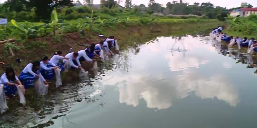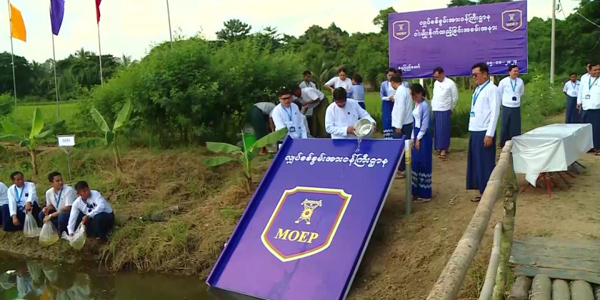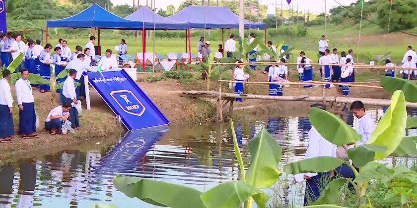 First, the ceremony of putting fish seeds took place, where the Union Minister and Deputy Minister put the fish seeds into a creek with one side closing near the seasonal crop fields. Directors General, senior officials, and staff who attended the event also took part in putting the fish seeds simultaneously.