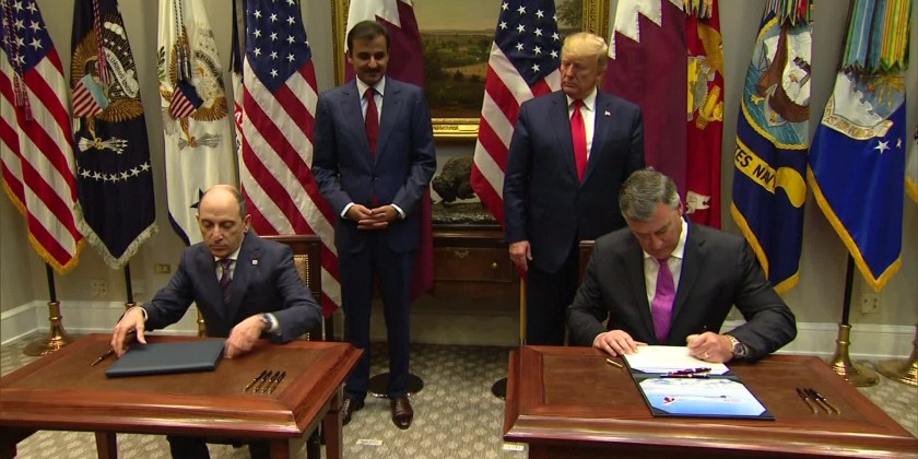 Qatar Airways signed an agreement with Boeing at the White House on Tuesday to buy five 777 Boeing cargo planes as the airline works to increase its footprint around the world. The national airline was one of several businesses from Qatar that inked agreements for business with U.S. companies on defense, energy and aviation projects. The signing event took place during a visit by Qatar's ruling emir.