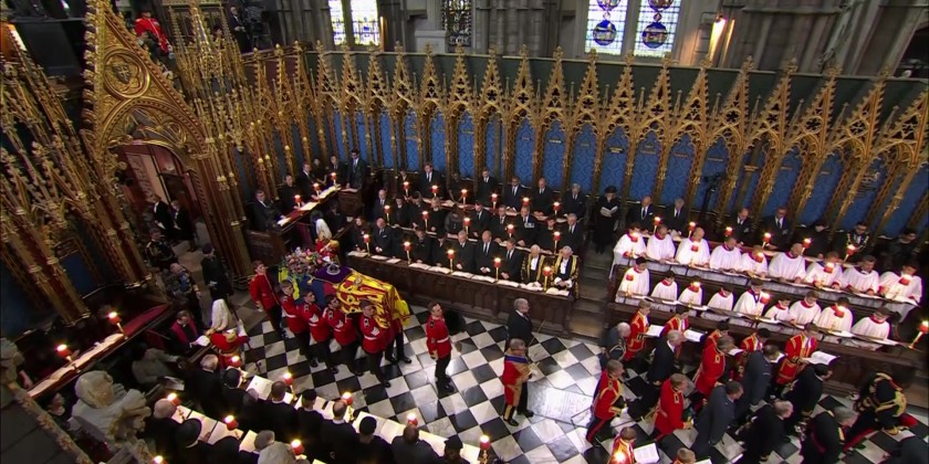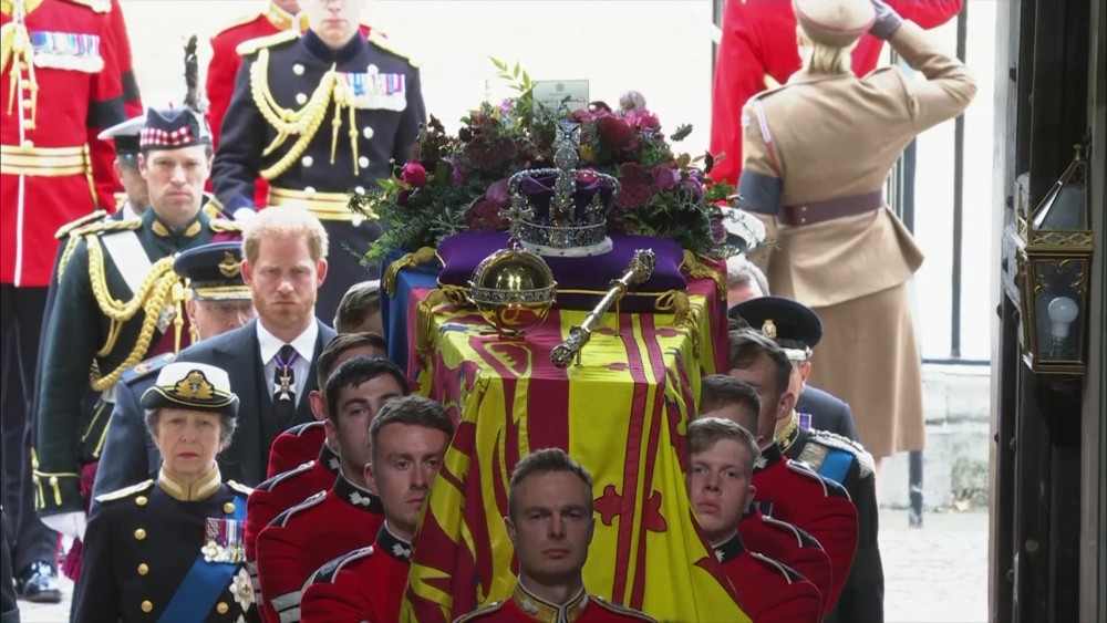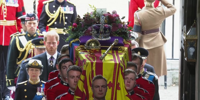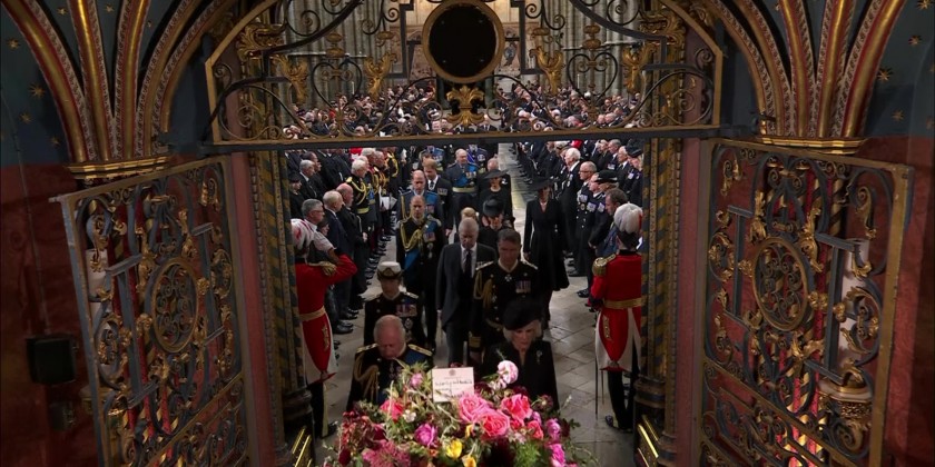 142 Royal Navy sailors drew the gun carriage carrying Elizabeth’s coffin to Westminster Abbey, with King Charles III and his sons, Princes William and Harry, walking behind as bagpipers played. Ahead of the service, a bell tolled 96 times - once a minute for each year of her life. After the service, Queen Elizabeth II’s coffin was taken on a gun carriage from Westminster Abbey for a last procession through the heart of London.
