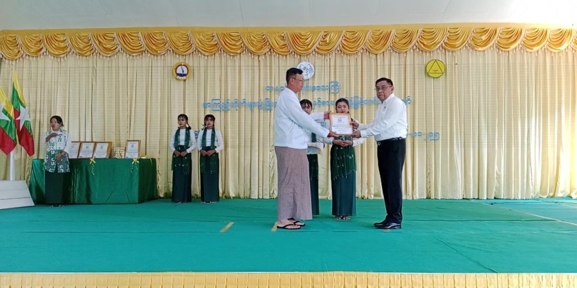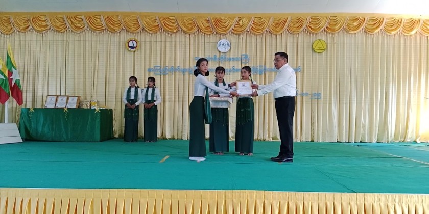 Subsequently, a capital fund of 2.5 million Kyats was awarded for purchasing band uniforms and musical instruments for BEHS (Bokepyin). The Region Chief Minister, the Region Chief Justice, Region Ministers, and officials presented various awards to the students who won prizes in the physical and intellectual capacity competitions of the Library Development and Reading Promotion Festival. Furthermore, books and reading materials were donated for the school libraries of eight high schools within Bokepyin District, as well as specifically for the BEHS (Bokepyin) school library, which were received by the responsible officials.