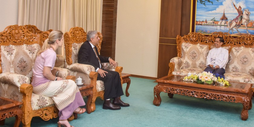 H.E. U Ko Ko Hlaing, Union Minister for International Cooperation received Mr. Sanjay Mathur, Regional Director of United Nations Office for Project Services (UNOPS) Asia Region based in Bangkok at 10 AMon 16th December 2022 at the Ministry of International Cooperation in Nay Pyi Taw.