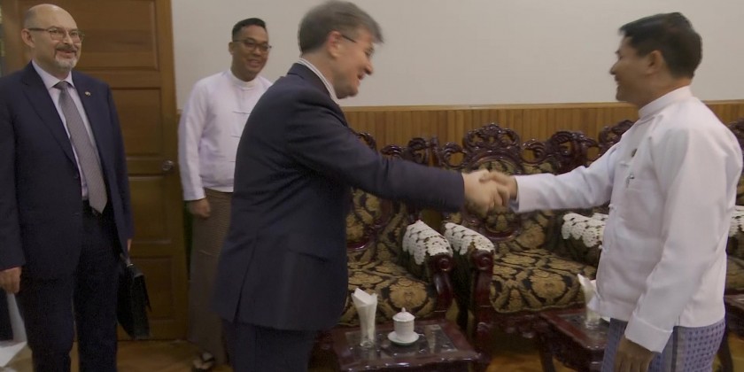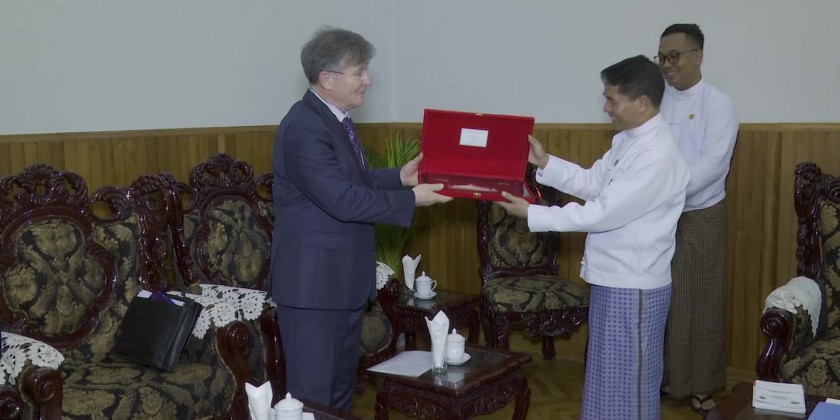 At the meeting with Russian Ambassador to Myanmar Mr. Iskander Azizov, the status of coordinating to sign MoU on the bilateral cooperation in fishery industry, collaboration according to the agreements in 3rd Russian-Myanmar G-G Trade and Economic cooperation Commission, the prioritized industries according to the outcome of the food security and related meetings between Myanmar and Russian Federation, constructing factory of natural growth of plant hormone, sustainable development of agricultural sector without environmental impact and high yield of crops, fertilizers suitable for geographical and climate situation of Myanmar to be imported from Russian Federation and the cooperation for acquiring market shares for agricultural products of Myanmar such as rice, beans and pulses were cordially discussed.