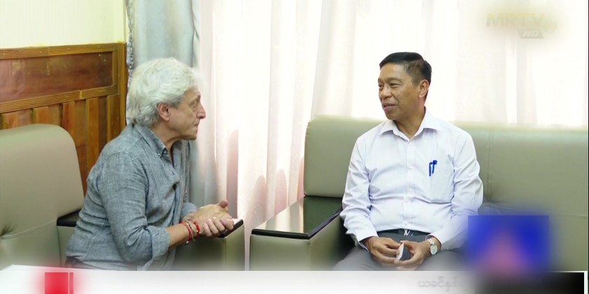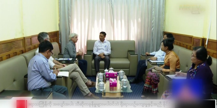 Union Minister for Social Welfare, Relief and Resettlement, Dr. Soe Win together with the Deputy Minister for Foreign Affairs U Lwin Oo meet with the Director of Mission of the World Food Programme (WFP) Mr. Paolo Mattei at the Disaster Management Center (DMC) in Nay Pyi Taw on 14 April.