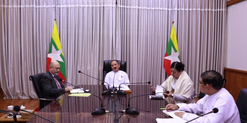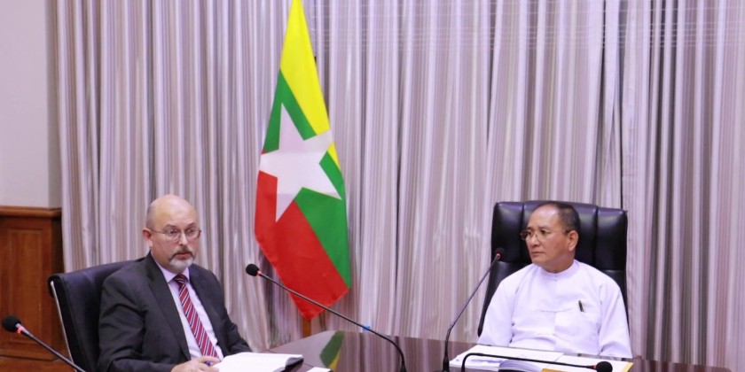 Union Minister for the Ministry of National Planning, Investment and Foreign Economic Relations, U Aung Kyaw Hoe receives Mr. Andrei Iunak, Counsellor in Economic Affairs, Embassy of the Russian Federation in the Republic of the Union of Myanmar at the Office No (1), of the Ministry, Nay Pyi Taw in the afternoon of 28 April 2026.