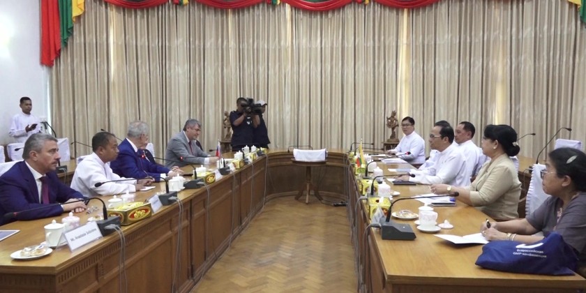Union Minister for Health Dr. Thet Khaing Win met with Mr. Evgeny Grigoryev, a member of the St. Petersburg government and chairman of the Foreign Relations Committee, Russian Federation, along with his delegation at the Ministry’s meeting hall in Nay Pyi Taw in the afternoon on October 14.