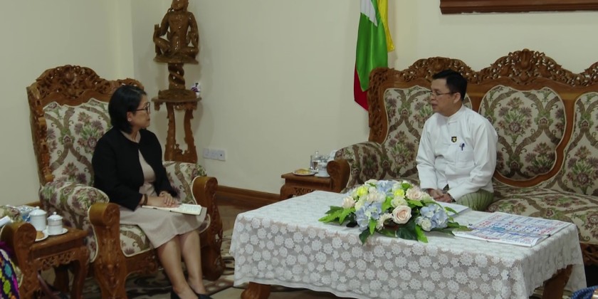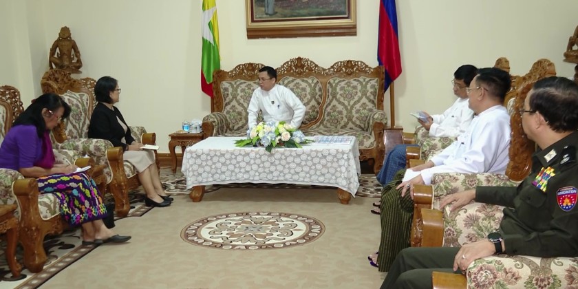 Union Minister for Immigration and Population, U Myint Kyaing, met with Ms. Noriko Takagi, the Resident Representative of the United Nations High Commissioner for Refugees (UNHCR) in Myanmar, and her delegation at the reception hall of the Union Minister in Nay Pyi Taw on December 5.
