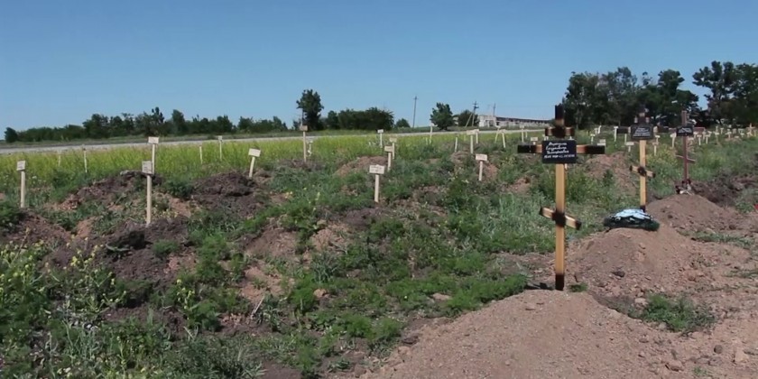 According to a Manhush resident, tractors from Ukrainian authorities began digging graves on the field near the local cemetery in February when the Russian military operation started.