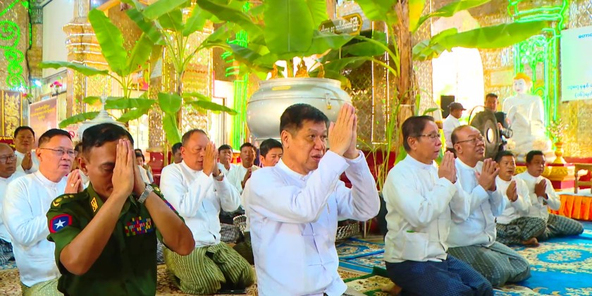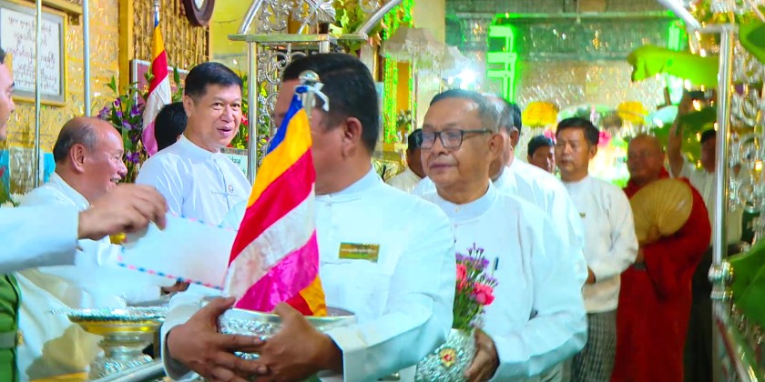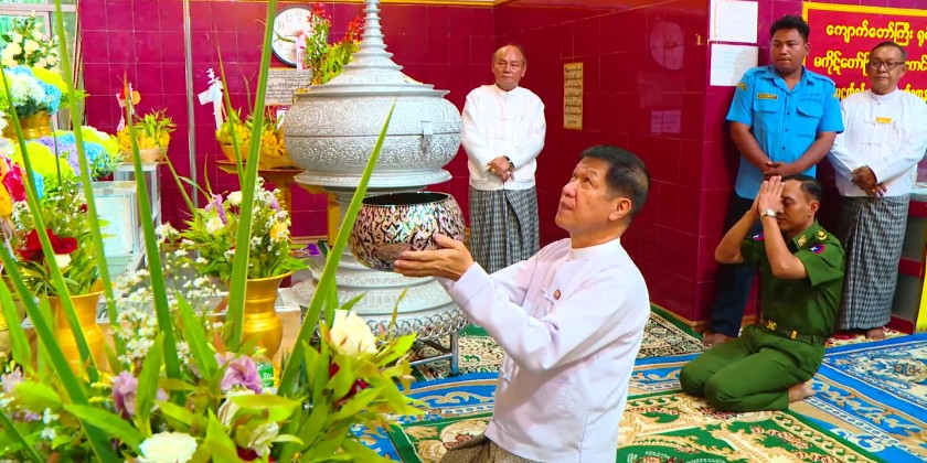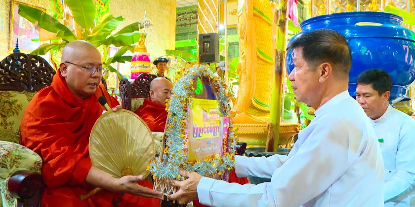 First, attendees received the Five Precepts from the Chairman Sayadaw of the Aungmyay Thazan Township Sangha Nayaka Committee and the Presiding Sayadaw of Kahtein Taw Monastery in East Khinmakan Taik. They then listened reverently to the Paritta suttas.