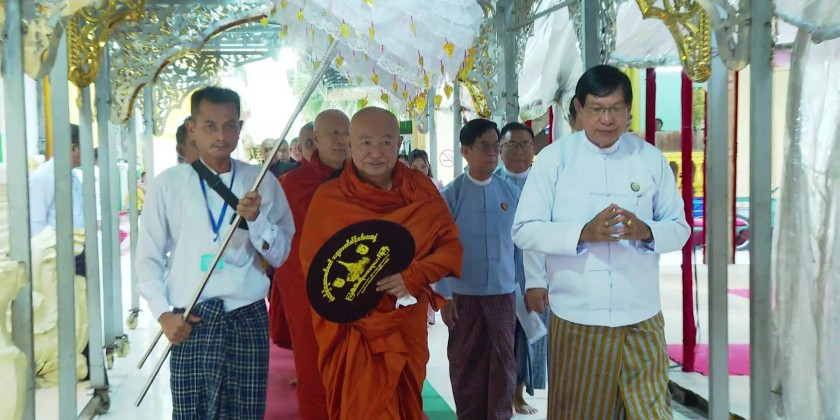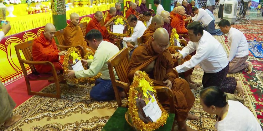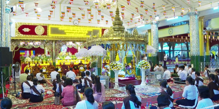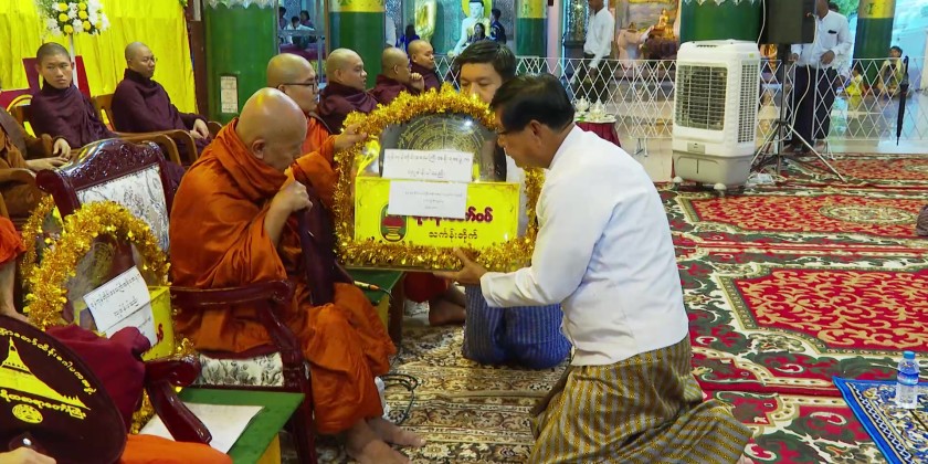 First, Yangon Region Chief Minister U Soe Thein, along with invited guests, took the Five Precepts from the Presiding Sayadaw of Tipitakalankara monastery, Chair of Yangon Region Sangha Nayaka Committee Bhaddanta Aggasami.