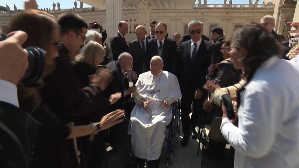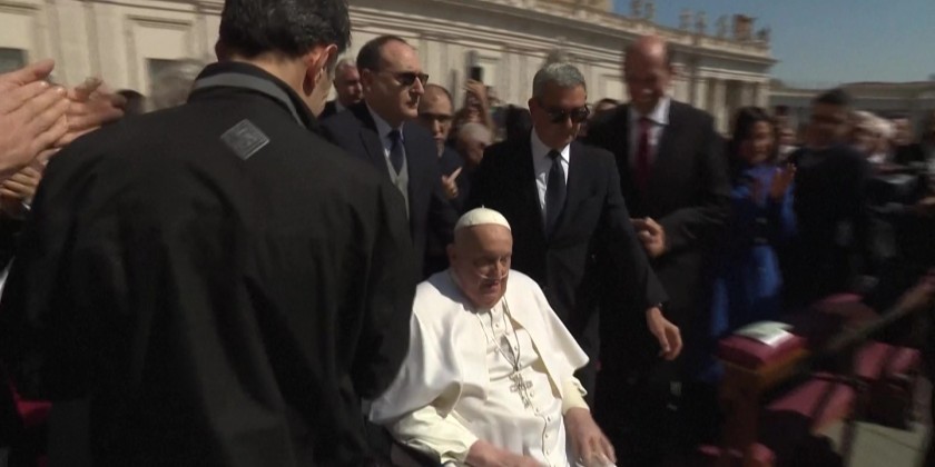 Pope Francis, who is recovering after a serious case of pneumonia, made a surprise public appearance Sunday as he mingled with crowds at the Vatican just two weeks after leaving hospital." A good Sunday to all. Thank you very much", the 88-year old Pope said as he was wheeled through Saint Peter's Square in his wheelchair after a mass dedicated to the sick.