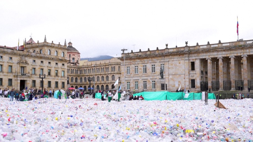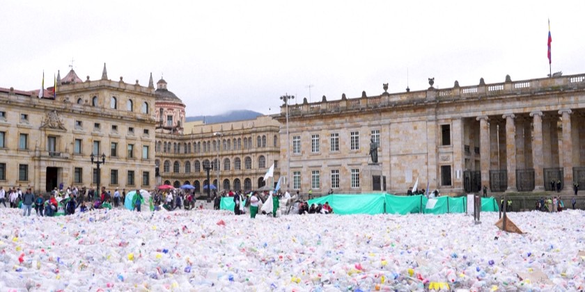 Colombian recyclers filled Bogota's iconic Plaza de Bolivar with plastic bottles, demanding better work conditions from the national government and city authorities. Bogota, home to 8 million people, lacks a public selective waste collection service, leaving nearly 26,000 recyclers to do the work.