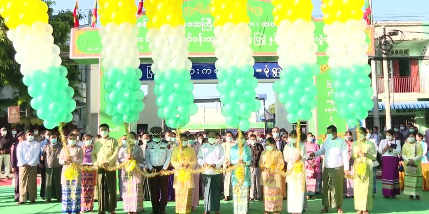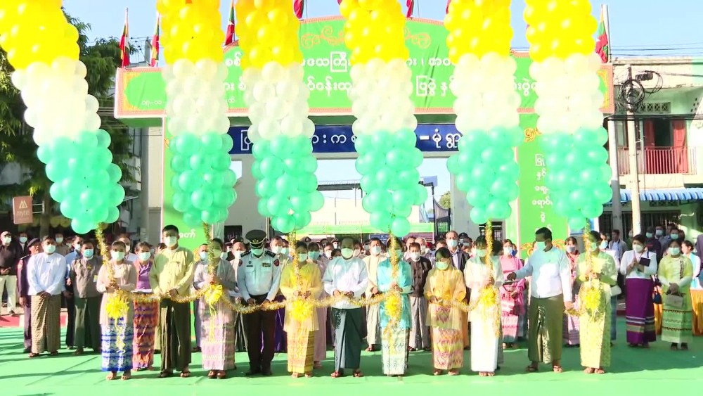 First, the Chief Minister, region ministers for economic affairs and social affairs, regional level departmental officials and chairman of Monywa district administration council opened the event by cutting the ceremonial ribbon.Next, the chief minister provided half million Kyats to the school band from No (2) Basic Education High School and posed for documentary group photo together with the officials concerned in front of the entrance gate.
