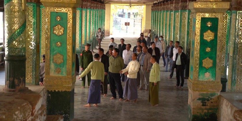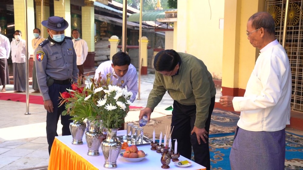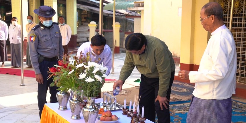 Magway Region Chief Minister U Tint Lwin together with the Region Minister for Economic Affairs and departmental officials visited historic Zeya Mingalar Shwe Inn Taung Pagoda in Taung Dwin Gyi on Thursday and donated flowers, water, oil and fruits to the pagoda and observed performing collective sanitation by departmental staffs on the pagoda platform.
