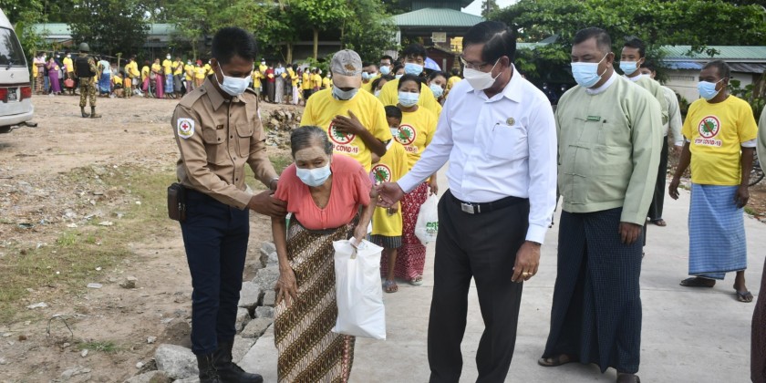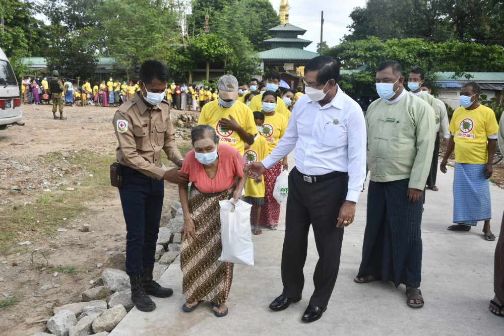 The Chief Minister and party encouraged selling of rice, edible oil and eggs at fair prices by the staff of the Township Administration Department under the supervision of Yangon Region Government and presented Yellow T-shirts printing COVID-19 preventive practices and masks to buyers.