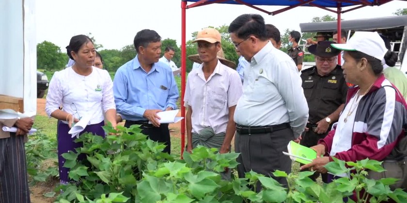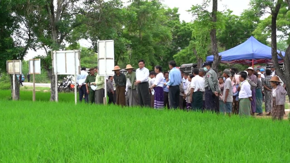 Magwe Region Chief Minister U Tint Lwin together with officials observed the pilot monsoon paddy plantation in Wachankar Village-tract of Taung Twin Gyi Township on 3rd August. He also met with the farmers and gave instruction for agricultural development.