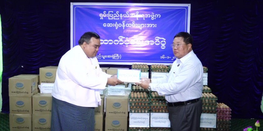 The State Chief Minister and official presented cash assistance provided Shan State Government, eggs and instant noodles to the Medical Superintendent for the staff in Lashio People’s Hospital.