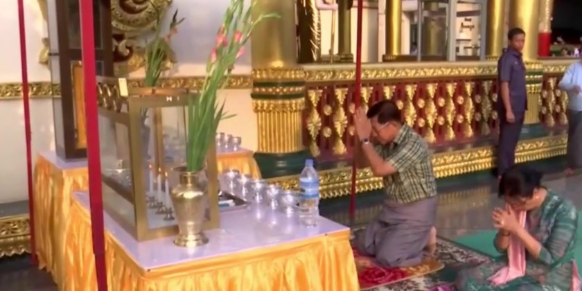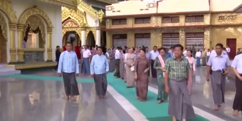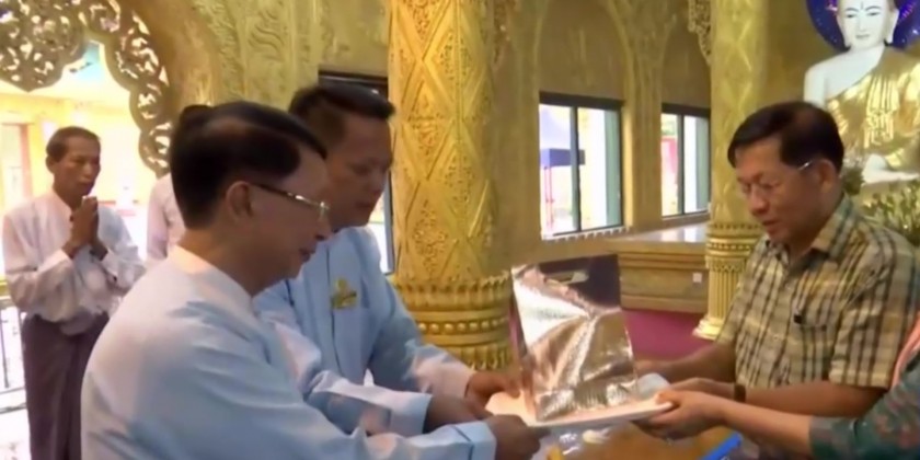 Later, the Prime Minister and party cordially greeted town elders in Pathein of Ayeyawady region. The Prime Minister and party then viewed around Pathein in a motor cade. They then visited Shwe Moke Htaw Pagoda in Pathein where the Prime Minister and wife and party paid homage to the pagoda and donated flowers, water and lights.