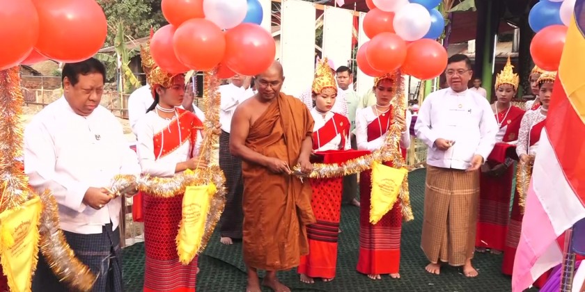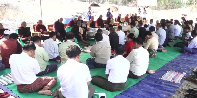 After listening to religious sermons from the Sayadaws, the Chief Minister and party donated offertories to the sayadaws and monks and shared the merits. At the auspicious time, organized by Sayadaws, the Chief Minister, the State Ministers and officials laid the foundation at the designated places and sprinkled with scented water.