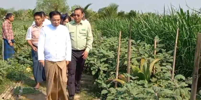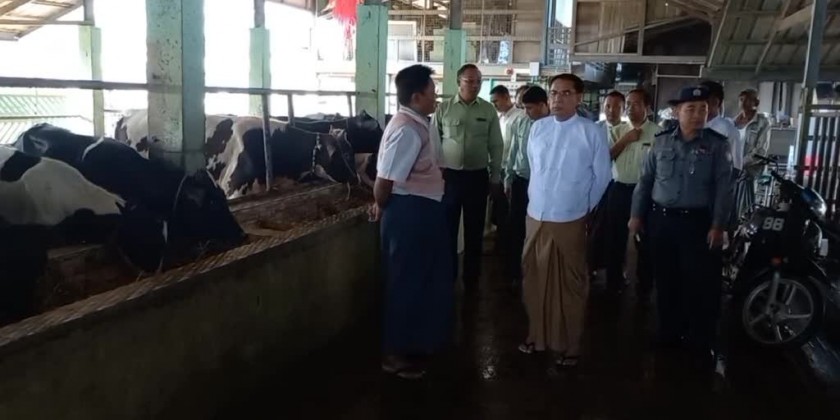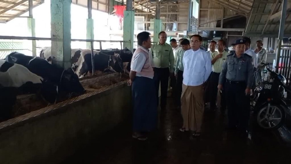 First, the chief minister and party visited a dairy farm owned by U Zaw Min Lwin in Bo Gone Ward and the farm in-charge clarified the raising the dairy cows, status of planting Nivea grass and para grass which is semi-aquatic and status of milk production.