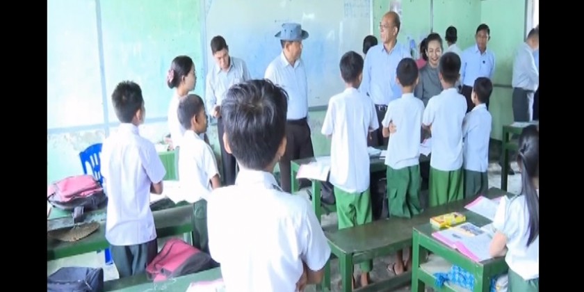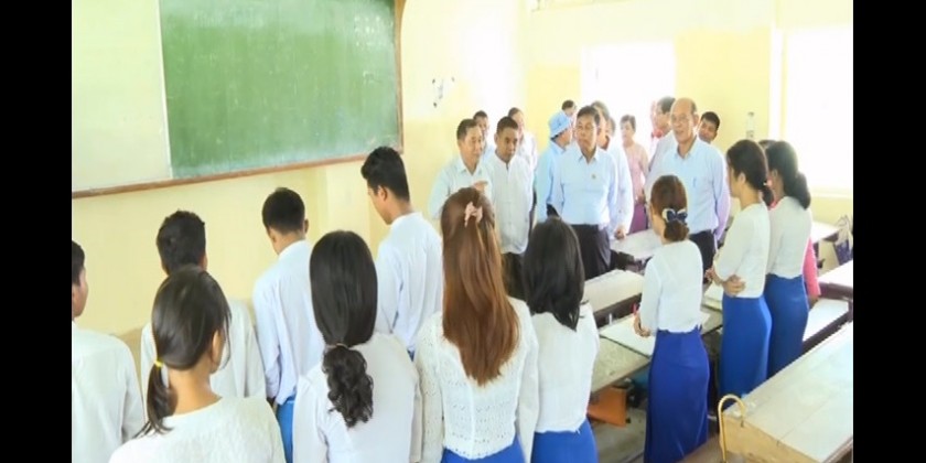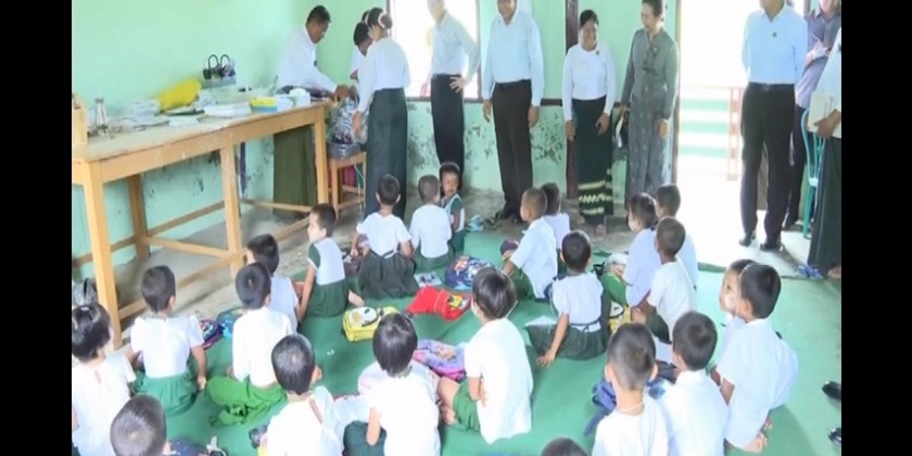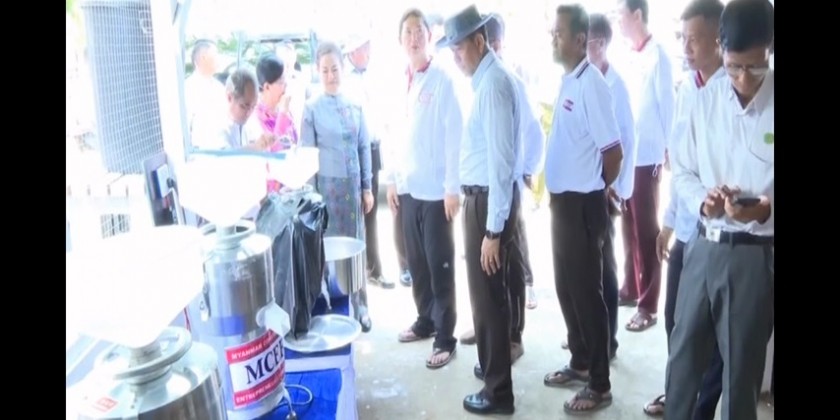 There, the Union Minister and party inspected completion of teaching building repairs and plans. There, they also viewed demonstration of soy milk production with a soy milk grinder. Also, the Union Minister and party visited 2 basic education high schools in Sittwe, inspected repair works and provided backpacks and vegetable biryani.