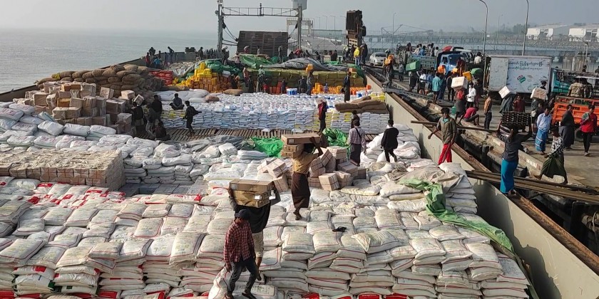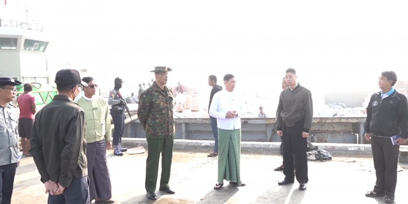 The MV Royal Venus, with over 2,455 tonnes of relief items and supplies including edible oil, fuel and foods, on board, is now docking at Sittwe Jetty. On 8th February, Chief Minister U Htein Lin and officials oversaw the arrangement for unloading of relief items by using manpower and machines, providing necessary assistance.