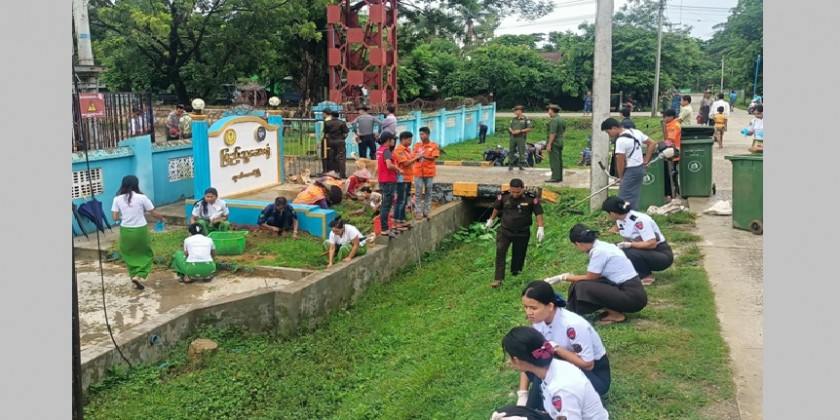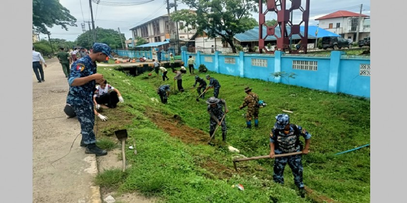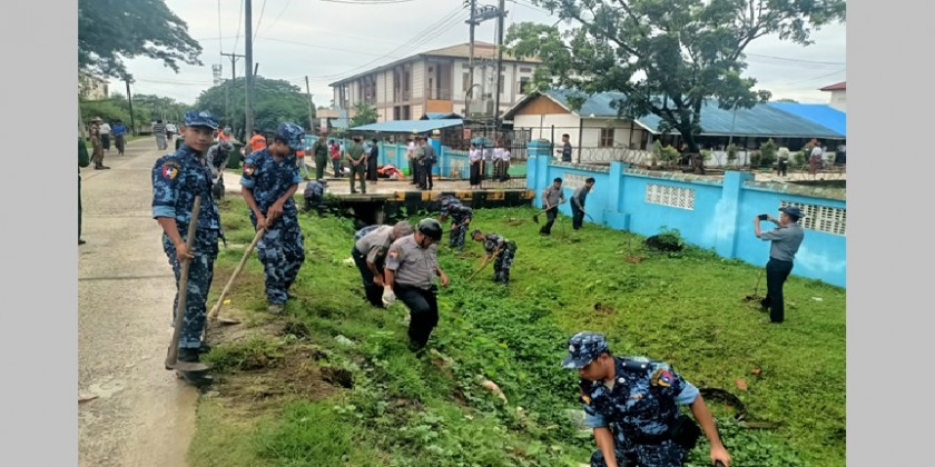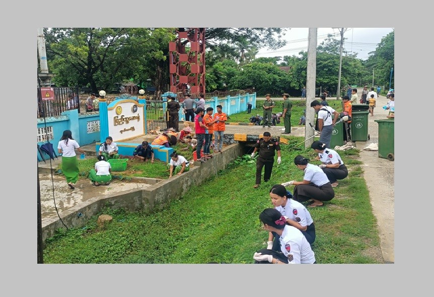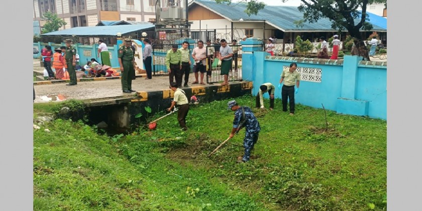 On the 15th of July, Lt-Gen Aye Win from the Office of the Commander in Chief (Army) and departmental officials who are currently in Buthidaung Township of Rakhine State inspected cleaning up the garbage and brunches of trees at the Buthidaung People’s Hospital by the Tatmadawmen and members of the Myanmar Police Force, No. (3) Border guard police force, and fire services as well as staff from the Township Development Committee and governmental departments and social organizations and local residents.