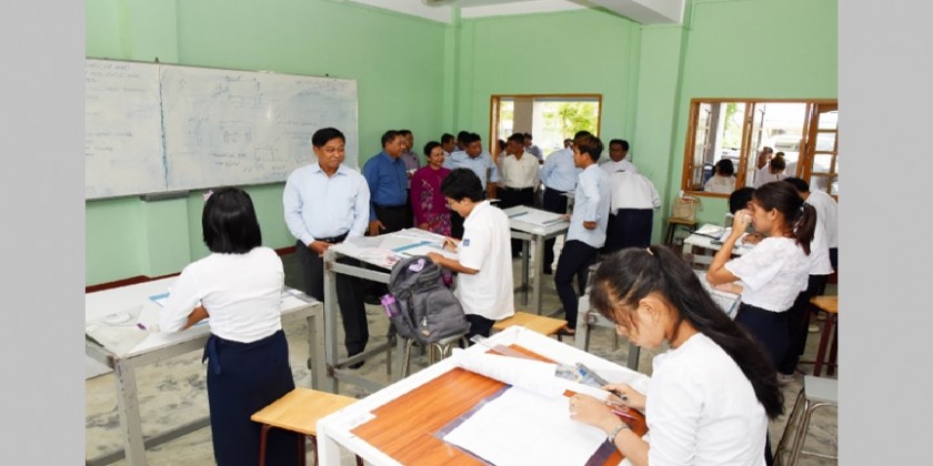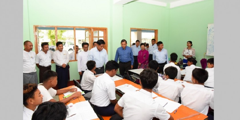 In the afternoon, Admiral Tin Aung San and party visited Government Technical High School (Sittwe) and observed students learning, repairing of school buildings and teaching halls and asked about future plans and cordially greeted students and teachers. 76 students are pursuing education at the Technical High School (Sittwe).