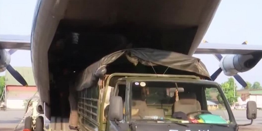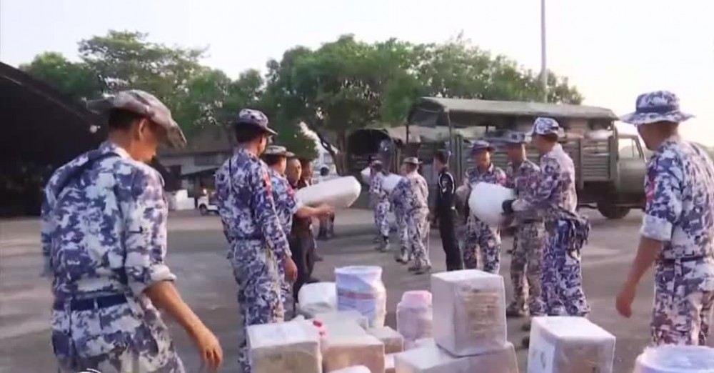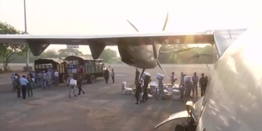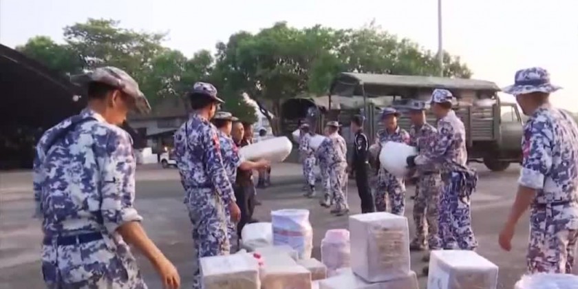The donation items contributed by families of Tattmadaw (Army, Navy and Air) and National Disaster Management Committee and well-wishers are being transported to affected areas by Tattmadaw aircrafts, helicopters and navy crafts. On 19th May, military aircrafts carrying 25 healthcare workers form Yangon region and rescue teams to provide health care and rescue services and donated items such as biscuits, 440 boxes of duck eggs, 100 boxes of instant noodle, 267 corrugated iron sheets and relief aid from Republic of India were transported to Sittwe airport via Mingaladon airport for three times.