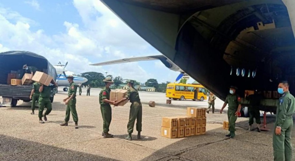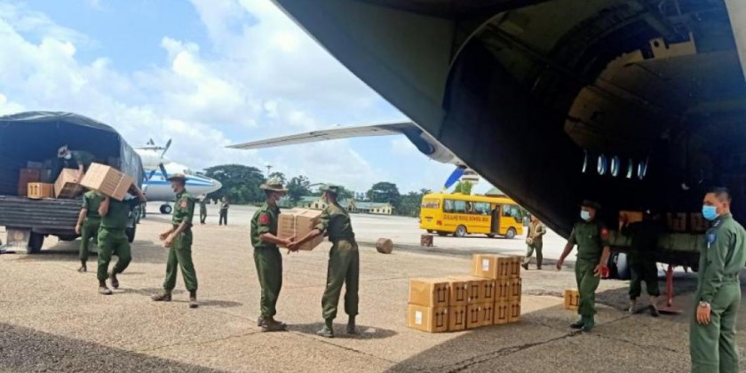 The military cargo plane left Yangon Airport and arrived in Sittway with the assistance to prevent, contain and treat COVID-19. The medical unit consists of an anesthesiologist, a lab technician, a physician, 2 medics and 10 nurses. The equipment include an oxygen plant, an ICU Ventilator (SV-300) 2 ICU beds, 3 suction machines, 3 pulse oxymeters, 3 patient monitors, 3 infusion pumps, 3 syringe pumps, a video laryngoscope, a mini-centrifuge, 10 oxygen cylinders (40L), an oxygen concentrator (5L), 3 BP Cuffs, 5 UV lamps, and 134 different types of medicine and apparatuses.