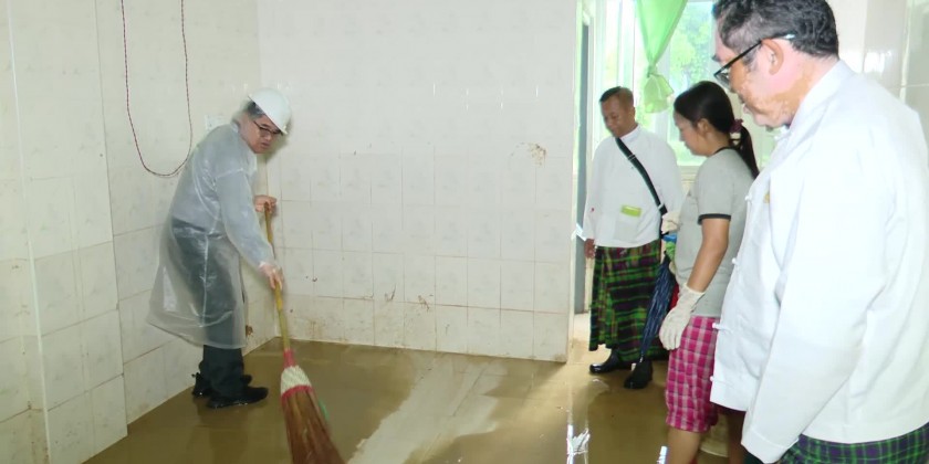 Then, the Chief Minister and party visited Wine Maw Township People’s Hospital and oversaw the collective cleaning tasks carried out at flood affected 2-stoery patient ward and comforted the patients, providing cash assistance. Later, the Chief Minister attended a donation ceremony for flood vicitms at Aung Chan Thar monestry in No.3 Ward.