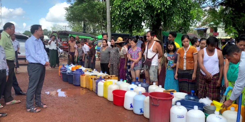 They then viewed the distribution of purified water under the arrangement of the Ministry of Cooperatives and Rural Development and the regional government at Kyauk Kyisu Ward, and clearing efforts to remove the blockage at the major drainage of Bago.