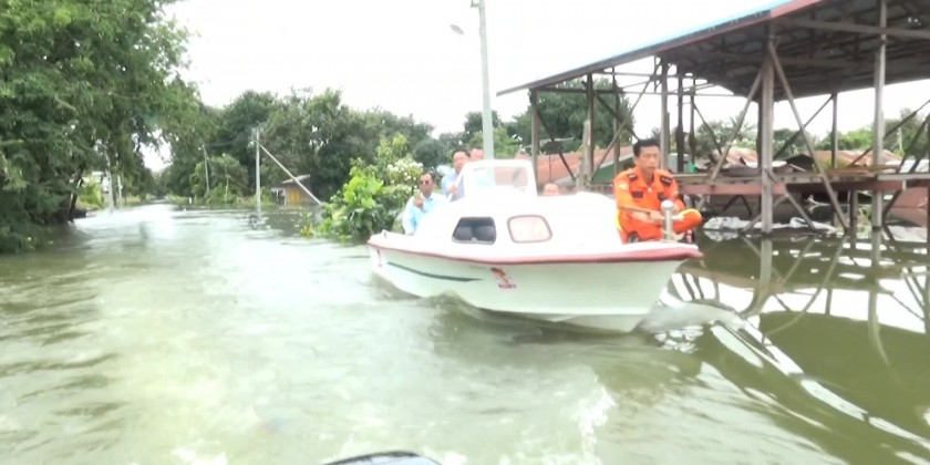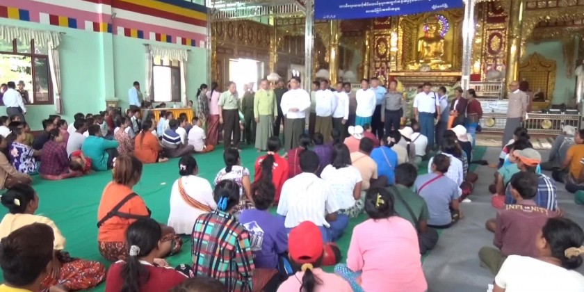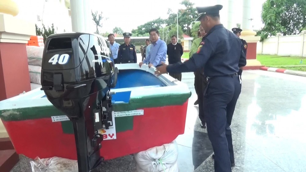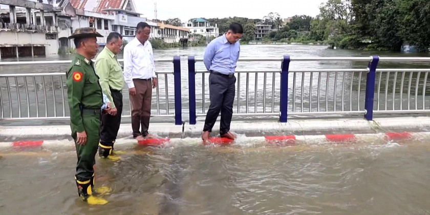 Next, they conducted a tour of Namt Kut and MinSu wards to evaluate the extent of the flooding, observing the submerged schools and homes, as well as the flooding at Kandarawati Bridge. In the afternoon, the Chief Minister and party attended a ceremony at Moe Kaung Pagoda to provide essential food supplies and cash to flood affected victims.