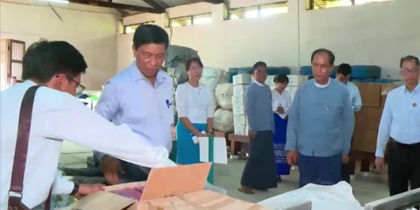 Next, the Union Minister heard reports presented by official from Mon State Disaster Management Department and fulfilled the requirements. He then inspected the storage of relief items and donated items in warehouse, met with staff from the affiliated departments at the office of Mon State Social Welfare Department and coordinated the requirements.