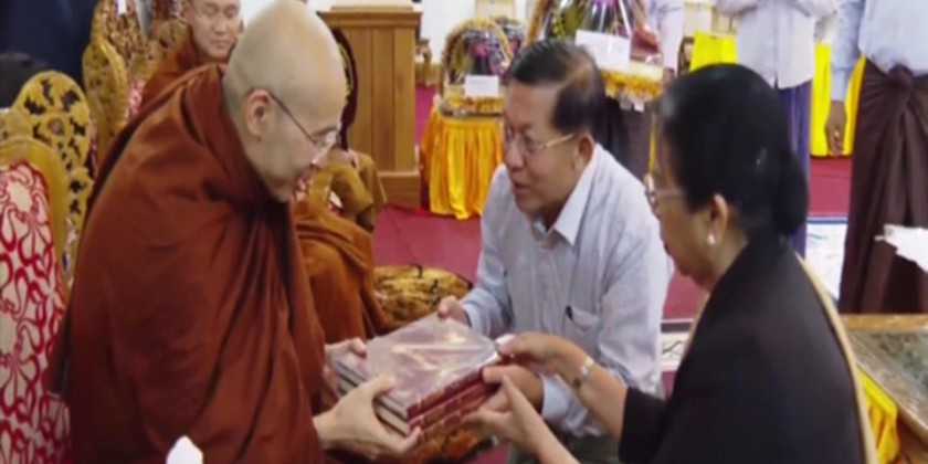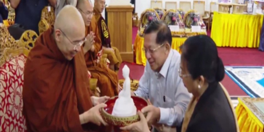 There, the Senior General and party paid their respects to the Oxford Sayadaw and offered the Tripitaka texts in Pali and Romanize Language, replica of the Maravijaya Buddha Image and other offertories to the Sayadaw. Then, the Sayadaw gave Dhamma books to the Senior General and party.