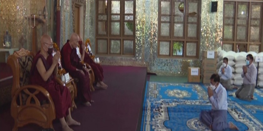 The Senior General paid respects to the Maha Wizithayon Monastery Nayaka Sayadaw and discussed with concerned officials to provide necessary assistance. There, 15 million Kyats, 5 bags of rice, 5 bags of bean, cooking oil, potato, onion, nutritious foodstuffs and medicines.
