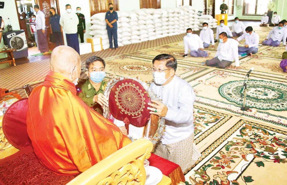 At the Monastery in Mahaaungmye Township of Mandalay Region, the Senior General offered eight kinds of prerequisites, cash for nine prerequisites, 100 bags of rice, 10 bags of gram, 100 visses of edible oil, nutritious foodstuffs and medicines donated by families of the Tatmadaw (Army, Navy and Air) to Bhamo Sayadaw.