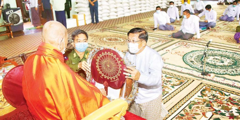 Members of the State Administration Council and Union ministers also donated alms to members of the Sangha. To the Sayadaw, the Senior General supplicated efforts for building Maravijaya Buddha Image in the Buddha Park of Dekkhinathiri Township in Nay Pyi Taw with the aim of showing the firmly flourishing of Theravada Buddha Sasana of Myanmar to the world, ensuring peace and stability of the nation, helping the region develop through visits of the local and foreign travellers to the Buddha image and contributing to the development of the country, stone inscriptions on Pitaka treatises, translating and publishing the Tri Pitaka treatises in Pali to English and arrangements for carving the stone inscriptions on Tri Pitaka treatises in Pali and English.