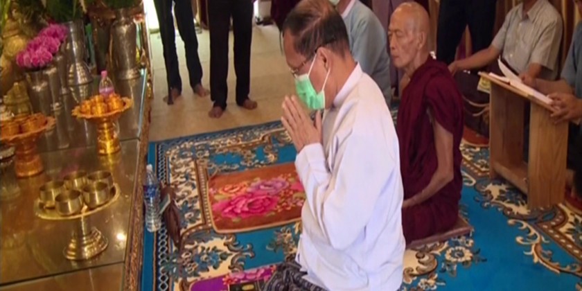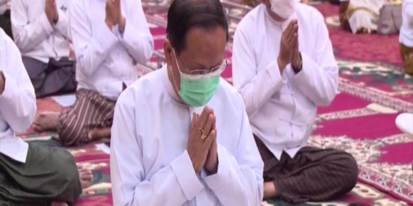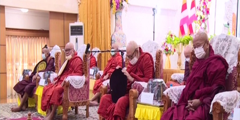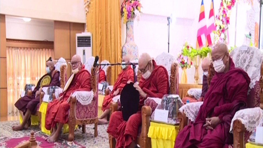 The Union Minsiter and officials receive the Five Precepts from Chairman Sayadaw of Theravada Buddhist Missionary Ovadasariya Committee Buddhanta Kumara and donated offertories.