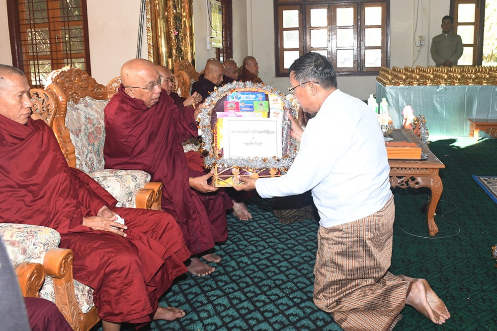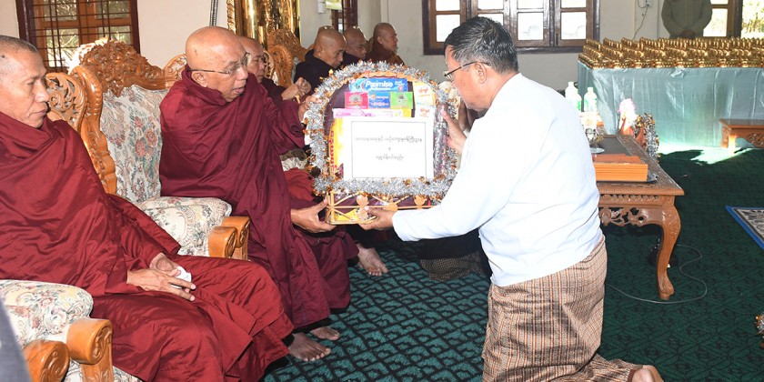 Union Minister for Religious Affairs and Culture U Tin OoLwin visited the MyoUAung Pagoda's Community Hall in Kyaukpadaung Township of Mandalay Region, paid respects to members of the Sangha, listened to guidance, supplicated religious affairs and offered cash and religious books to the members of the Sangha.