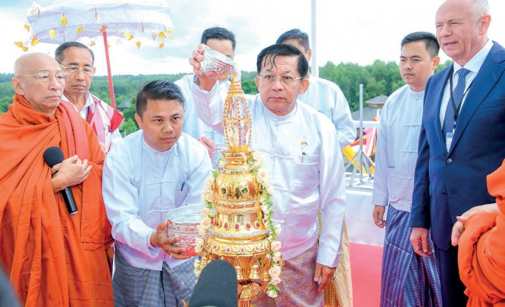 The Sitagu Sayadaw, the Senior General, Russian Deputy Defence Minister Colonel General Alexander Vasilievich Fomin and senior officers from Myanma Tatmadaw and the Russian government tolled the bell three times for the successful completion of the ceremony.