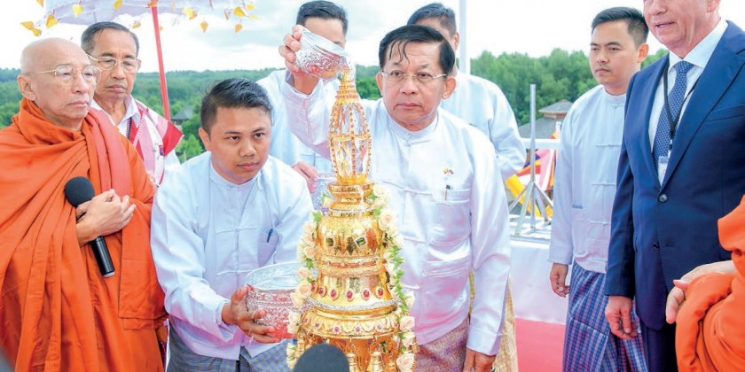 Academies Sitagu Sayadaw Dr Bhaddanta Nyanissara, Vice-Chairman of the State Sangha Maha Nayaka Committee Kyaukme Sayadaw Dr Bhaddanta Candanassara, Tipitaka Sayadaw Bhaddanta Silakkhanda Bhivamsa and Rector of International Theravada Buddhist Missionary University Dr Bhaddanta Chekinda (Dhammaduta Sayadaw), the reverend father of Orthodox and lamas. Chairman of the State Administration Council Prime Minister Senior General Min Aung Hlaing, wife and party conveyed the jewel-decorated diamond orb, pennant-shaped vane and round the pagoda clockwise and hoisted them atop the pagoda.