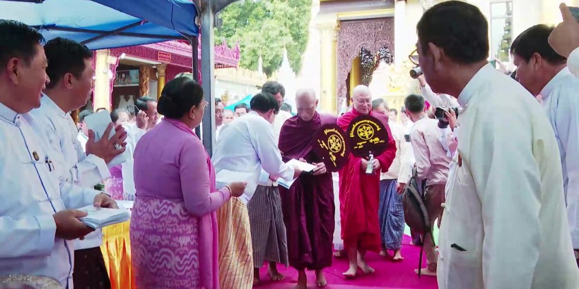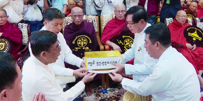 Next, Chief Minister of Yangon Region U Soe Thein and wife donated cash and offertories to the Chairman Sayadaw of State Sangha Maha Nayaka Committee. The Chief Minister also donated over 59 million kyats, contributed by the Yangon Region Government for 5,555 members of the Sangha.
