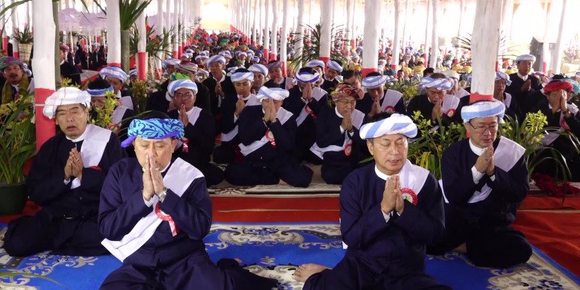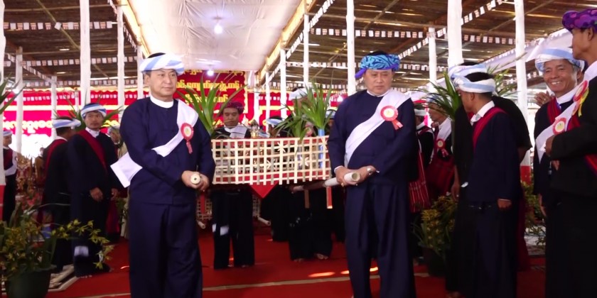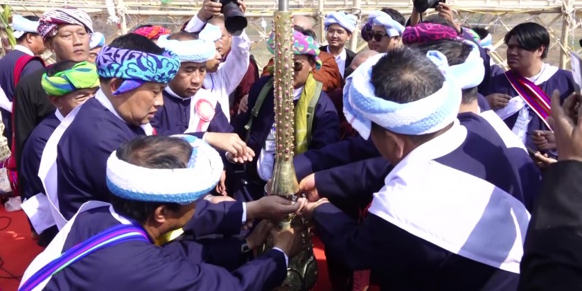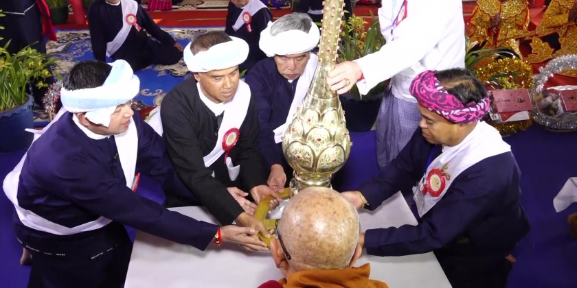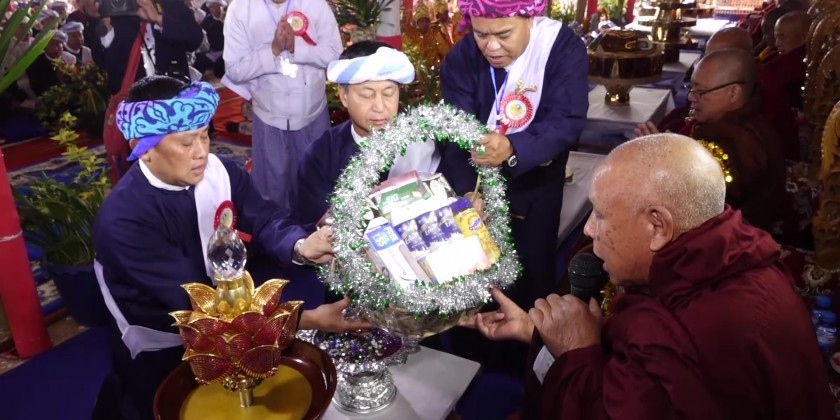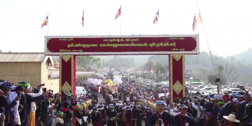 Members of the Sangha, member of the State Council U Khun San Lwin, Shan State Chief Minister U Aung Zaw Aye, Chairman of the Pa-O Self-Administered Zone Administration Body and many other officials as well as well-wishers took part in this religious ceremony to hoist the Diamond Orb and Golden Umbrella atop the Bo Panta Hill Maha Wuntha Bodh Gaya Pagoda in the Pa-O Self-Administered Zone.