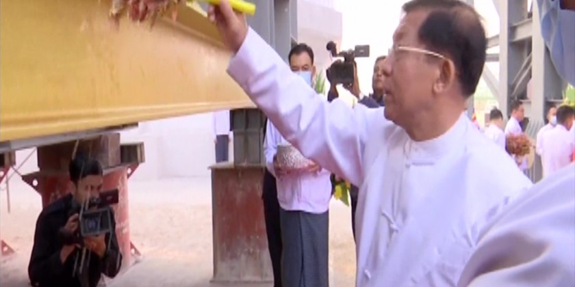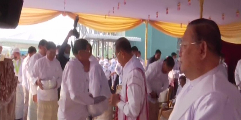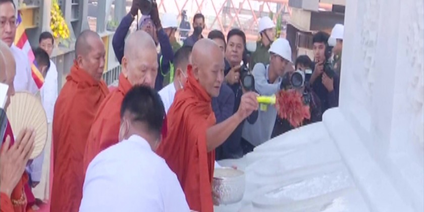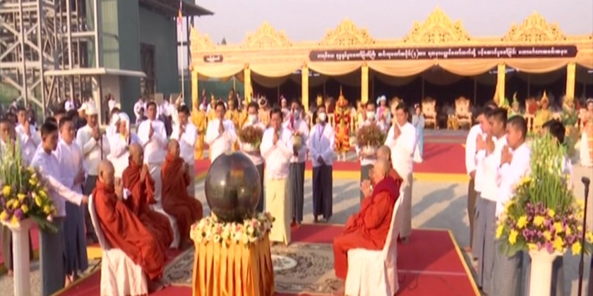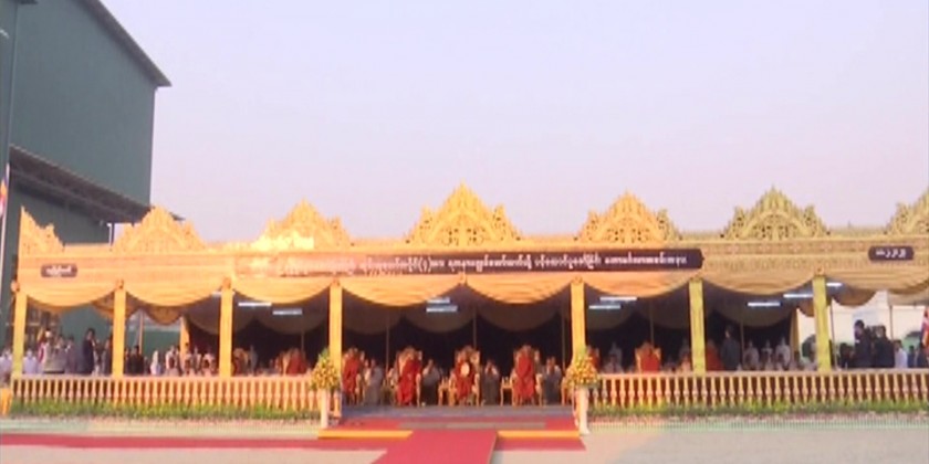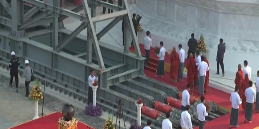 The ceremony was opened by reciting Namo Tassa three times, followed by the religious rituals. The congregation listened to the Parittas and Gadas, delivered by the Sayadaws. Led by the Sayadaws, the Prime Minister and party took positions at the designated places and sprinkled scented water to the Yadana Throne, Steel Frame that include Part(4) of the Buddha Image and the Steel Tower Crane.