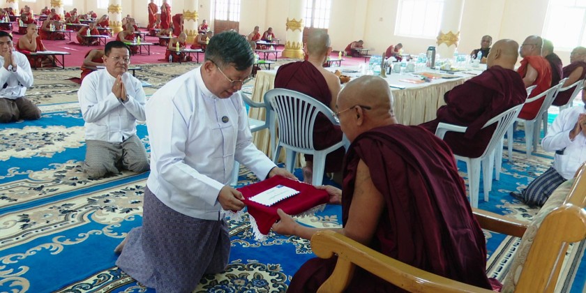 The Union Minister for Religious Affairs and Culture, U Tin Oo Lwin, along with Naypyidaw Council member and officials, paid homage the members of Sangha and Nuns who were taking the government Dhammacariya exam in Mingalar Byuhar Sasana Beikman in Pyinmana Township of Nay Pyi Taw Union Territory on Tuesday.