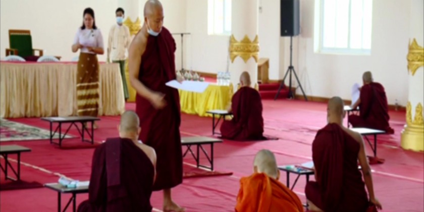 The Union Minister and party later viewed the members of the Sangha and nuns who are sitting for the Government Dhamma Cariya Exams. 398 members of the Sangha, 58 nuns and 1 lay person, altogether 457 are sitting for the exam in the Union Territory Nay Pyi Taw, Pyinmana and Tatkone.