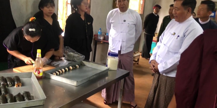 The Deputy Minster and party then encouraged the students learning vocational skills like tailoring, baking, and literature. After that, the Deputy Minister visited Naung Taung Nunnery School, where he discussed issues related to textbook availability and maintaining a balanced student-teacher ratio. He also toured the school library and observed the nuns' peaceful learning.