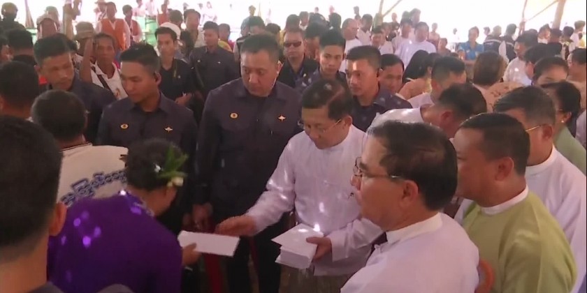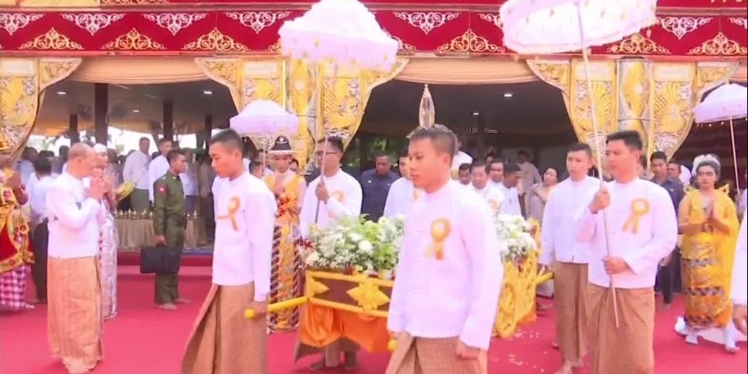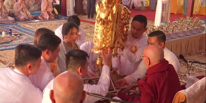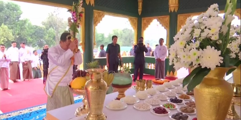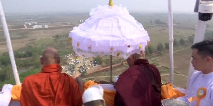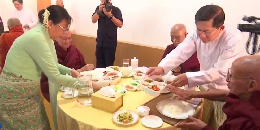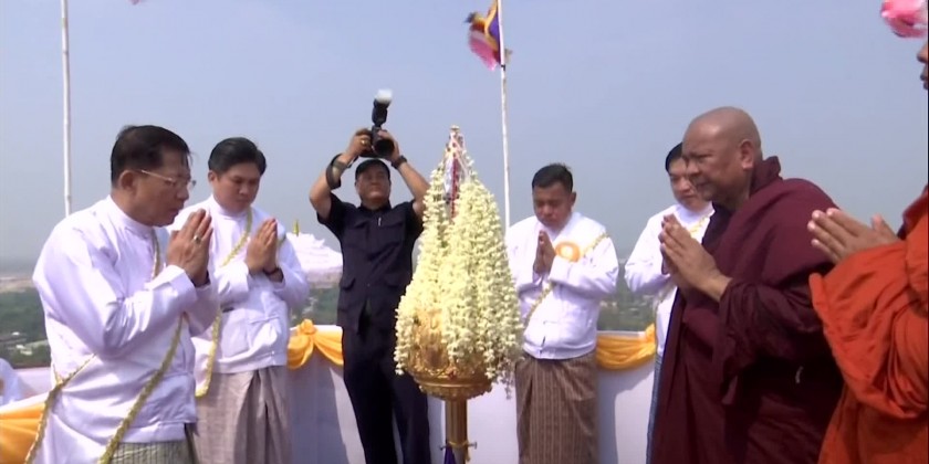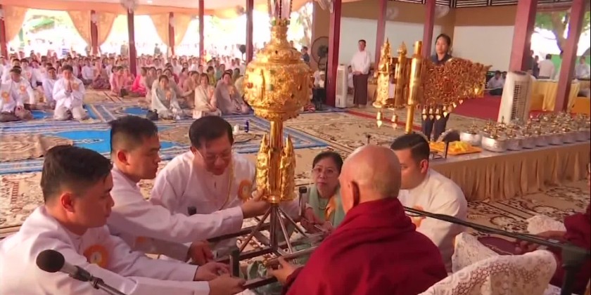 Later, the Prime Minister and wife, and family members offered a diamond orb and religious objects to Thanlyin Min KyaungSayadaw, and a pennant-shaped vane and offertories to the MyoMaSayadaw.