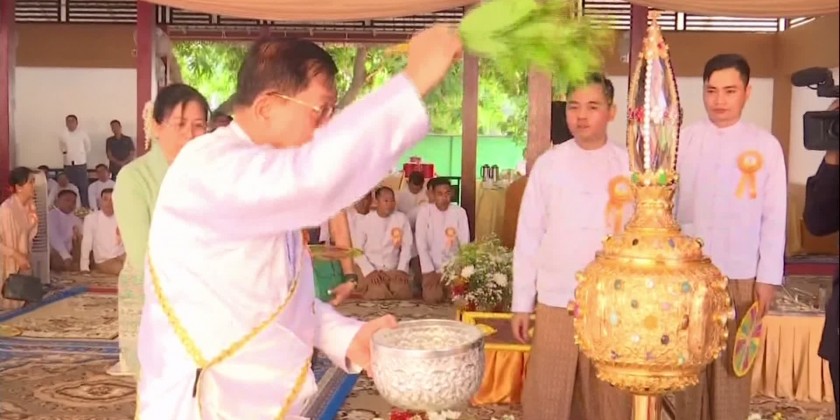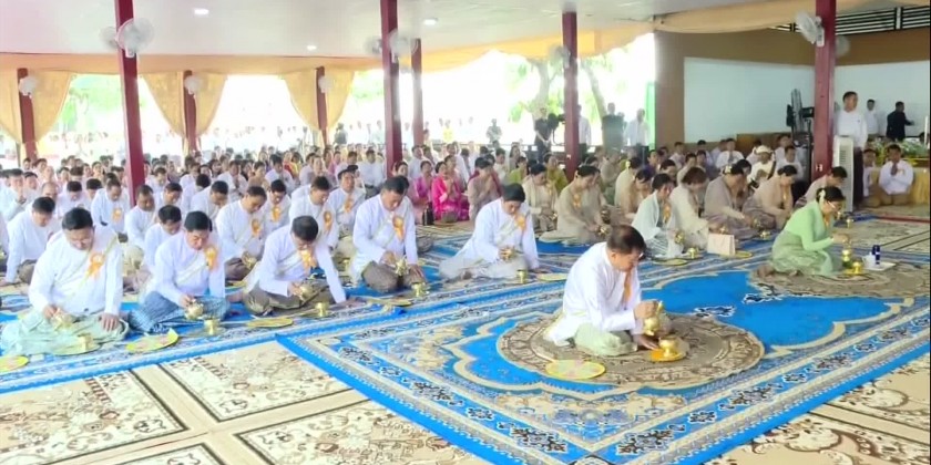 Then the Prime Minister and wife, and congregation took the nine precepts by Patron Sayadaw of Kyakhat Wine Sarthintaik in Bago, and offered holy flower,water, thread and sand to the Sayadaws.